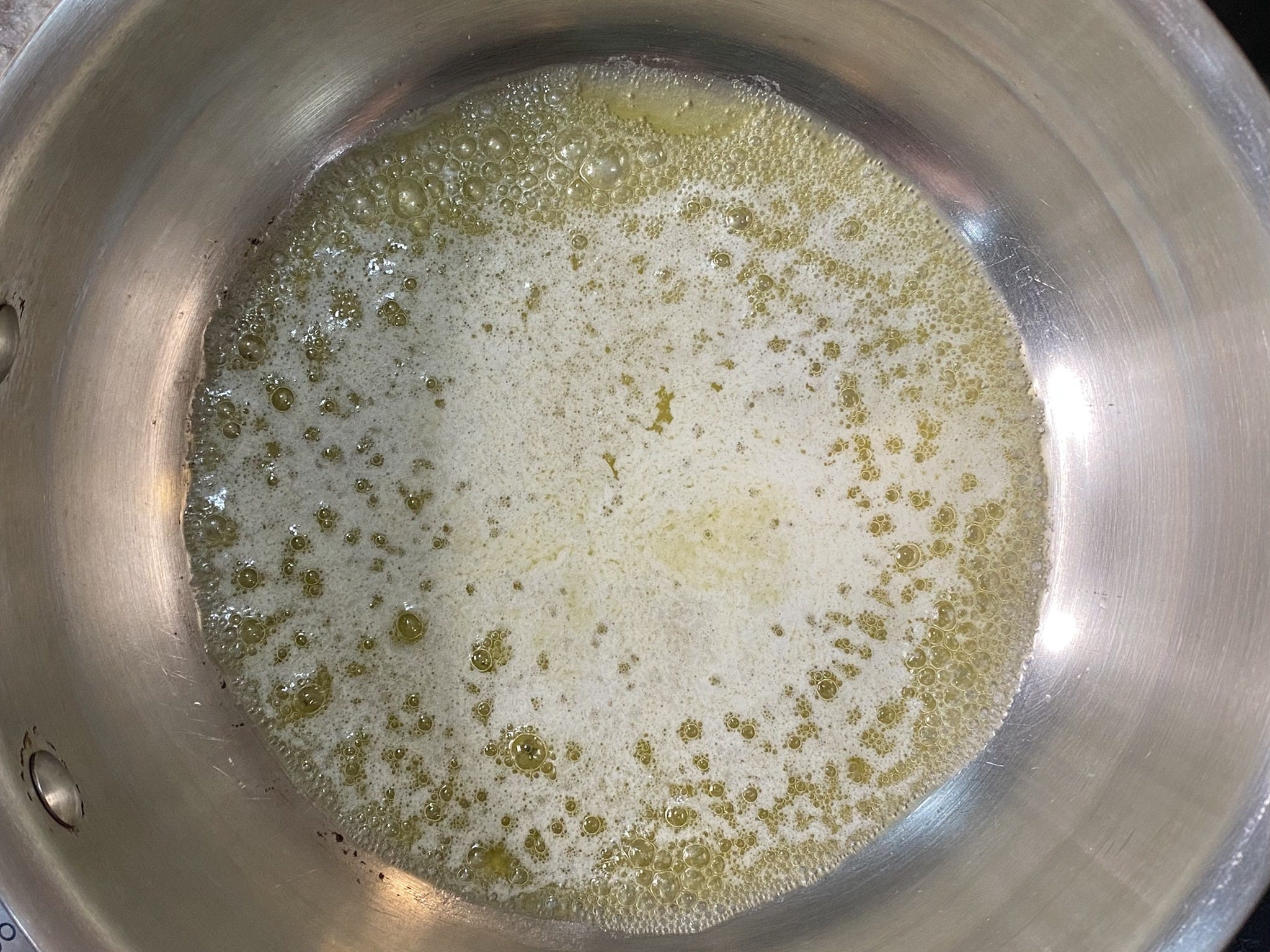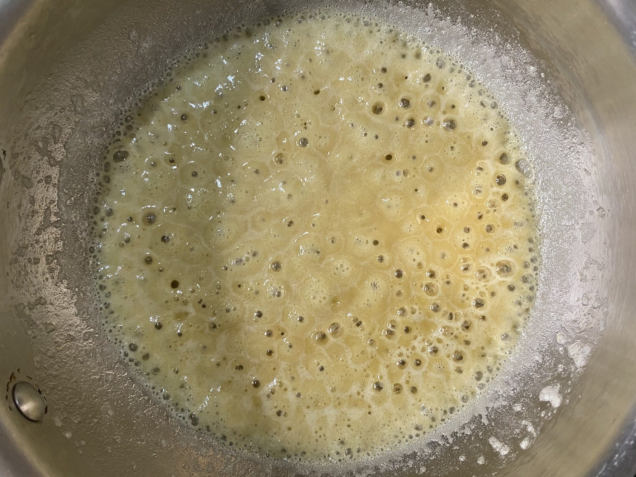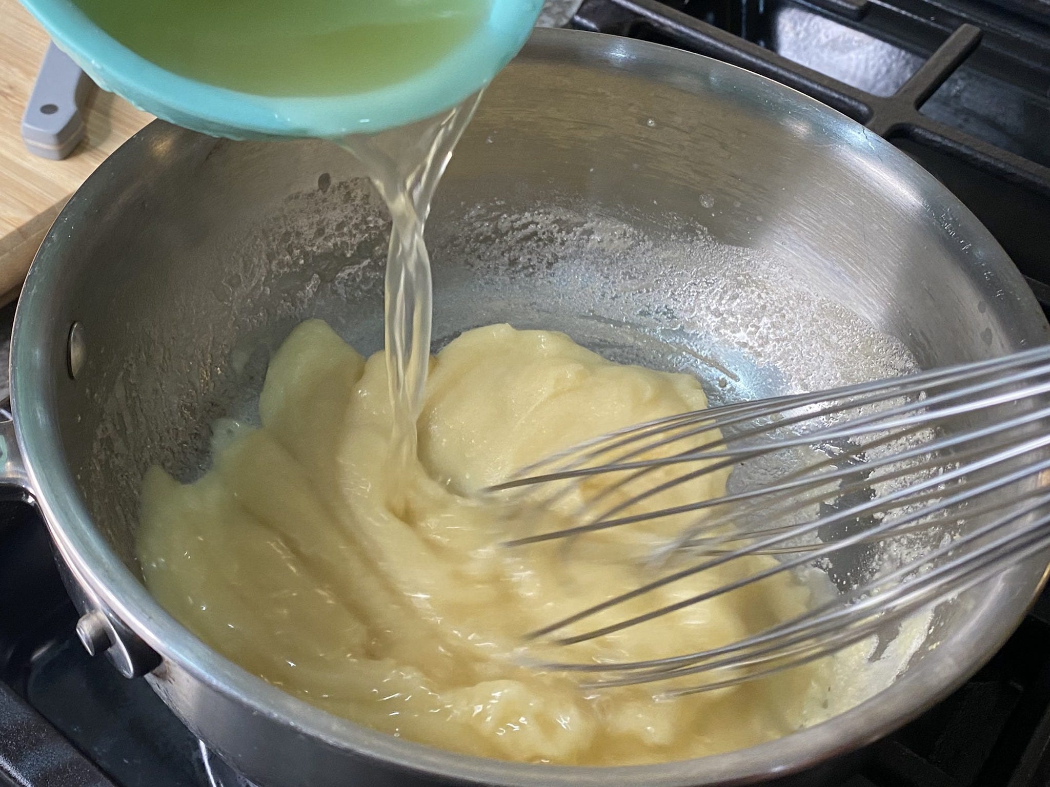 Add the flour all at once and whisk it into a smooth paste. Cook until the flour goes from smelling starchy to nutty and looks foamy and blonde.