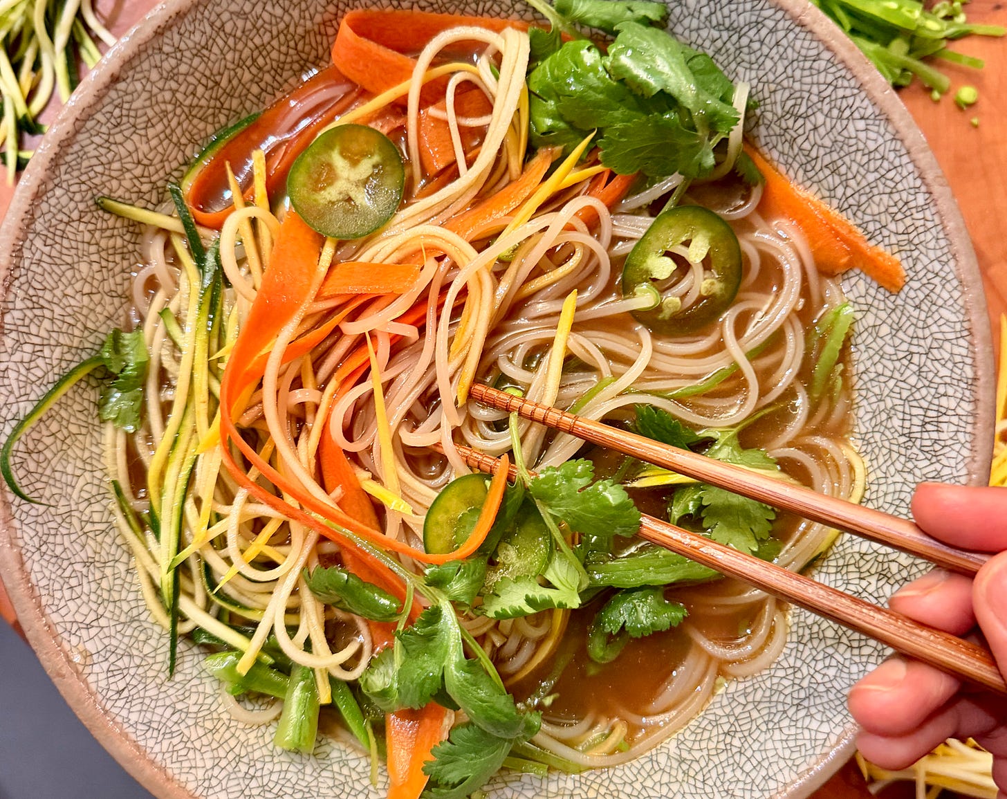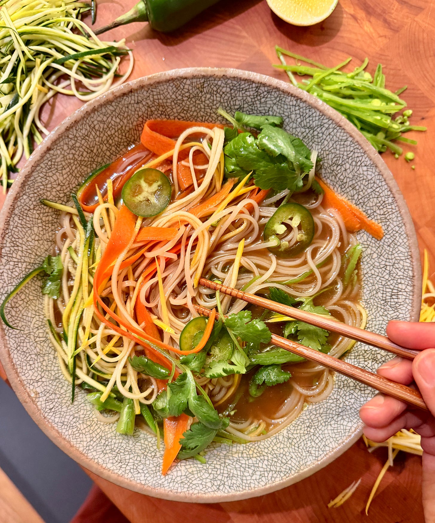 Cook the rice noodles according to the package instructions and divide them into bowls. Pile on whatever tender vegetables you like, thinly sliced or shaved with a peeler (I like snap peas, zucchini, radish, green onions, button mushrooms, and baby carrots). Pour over the hot broth and garnish with torn cilantro, mint, and sliced jalapenos. Serve with lime wedges and sriracha alongside.