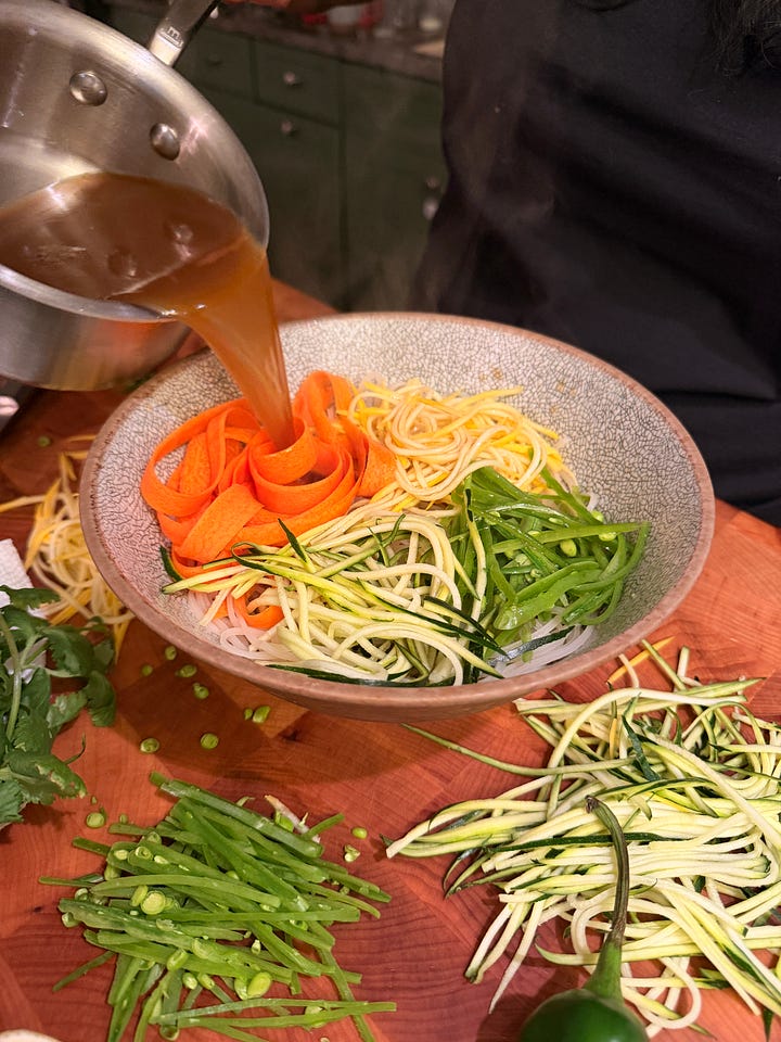 For this spring version, I keep the broth itself classic with charred ginger and onion, star anise, cinnamon, and fish sauce. Then, instead of pouring the hot broth over shaved meats, I pour it over a nest of thinly sliced raw veggies that barely wilt from the heat.