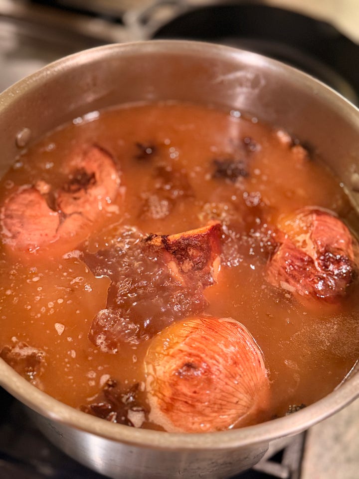Meanwhile, set a rack just under the broiler and heat to high. Place the onion and ginger, cut side up, onto the tray you just used to roast the bones. Broil until blackened, 8 to 12 minutes, then add to the pot with the bones.