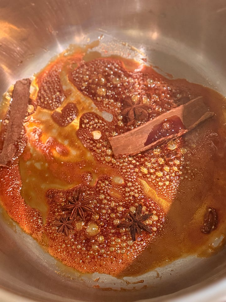 Sprinkle the sugar evenly along the bottom of a large stockpot and place over medium heat. Cook, swirling the pan occasionally, until deeply caramelized, about 5 minutes (donāt worry if itās not evenly colored). Add the star anise, cloves, and cinnamon, to toast in the caramel, swirling the pot until aromatic, 30 seconds. Quickly (and carefully!) add the water to halt the cooking and prevent the sugar from browning. Turn off the heat.